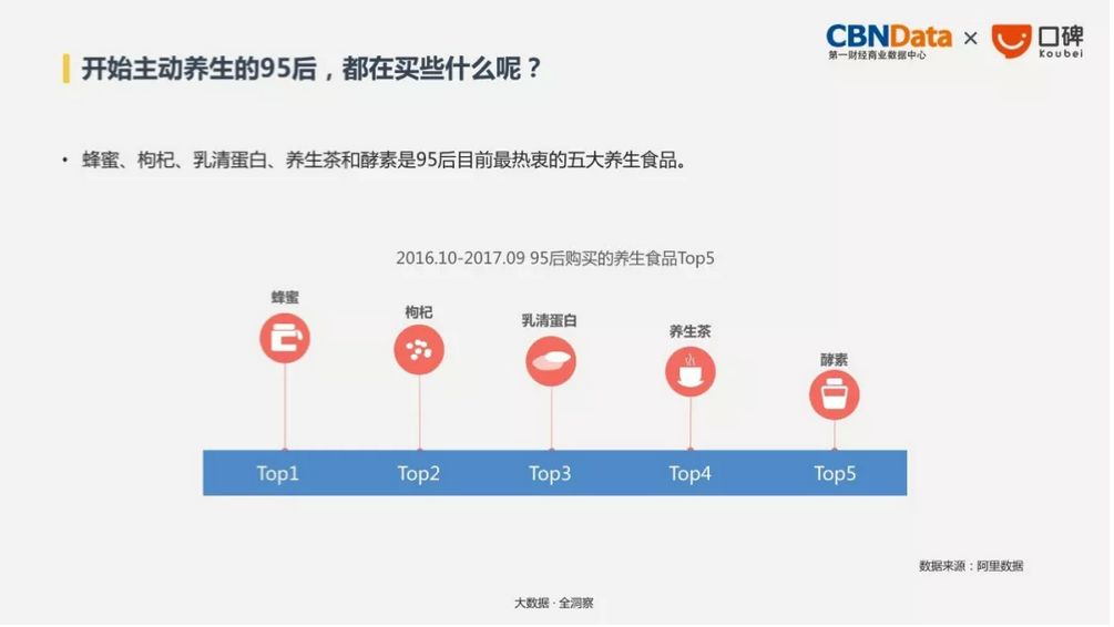 其中,目前95后最热衷的养生食品前五位包括:蜂蜜、枸杞、乳清蛋白、养生茶、酵素。