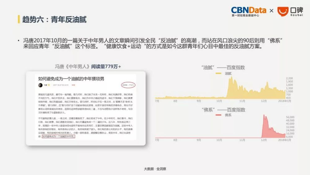 2017年一篇关于“油腻中年男”的文章迅速传播,影响大家广泛的回响。各种消费数据显示,青年人对健康食品和运动的热情有增无减。
