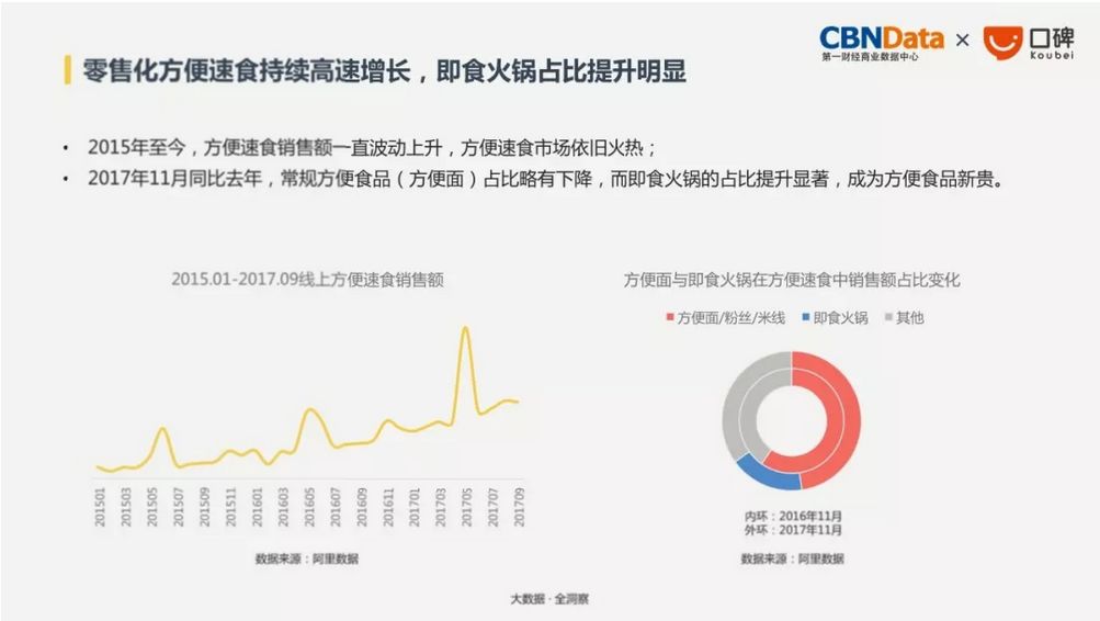 从2015年至今,方便速食的销售量一直稳步上升,而方便食品的新贵:方便火锅在2017年更是急速蹿红。其中,90后和95后对方便火锅最为偏爱。