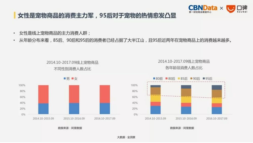 其中女性是线上宠物用品的消费主力,目前90后在消费人群中占比最高,不过95后的消费增速已经超过90后。