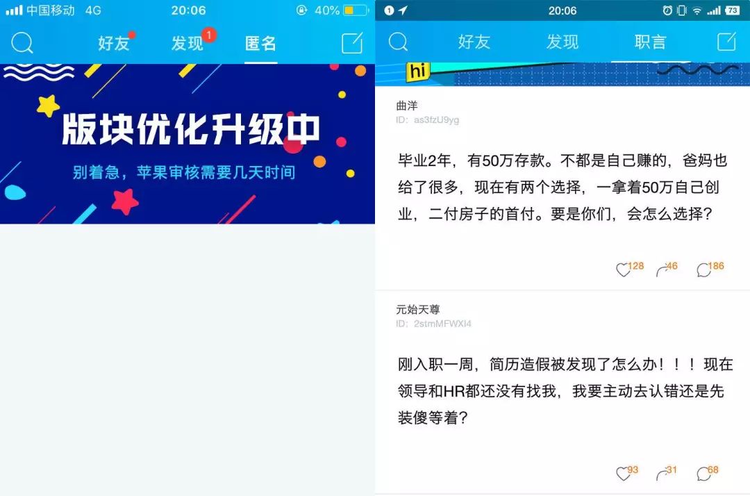 关闭匿名区之后,脉脉剩下的功能仅仅是名片交换、个人动态、职业招聘、热文推荐等内容,但是这些板块加起来的活跃度和流量均不及匿名区。如果按照Android版app的更改,匿名区改为“职言”后,ID出现在匿名者的名称下方,也将大幅度降低用于参与发帖的欲望。“匿名区毕竟占了全站的超过一半。”邵女士再一次强调。