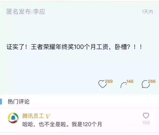 前不久脉脉匿名区有人爆料,腾讯旗下人气手游《王者荣耀》团队的年终奖有100个月工资。随后还有腾讯员工证实,“没有啦,也不全是,大部分是120个月,最低的100个月······”