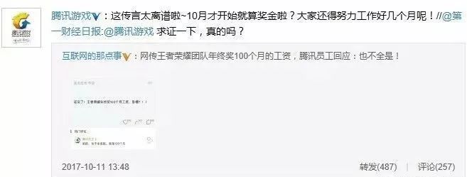 腾讯游戏称消息不属实,“目前Q4季度刚开始,怎么可能现在就公布年终奖?至少要到年底才知道”。