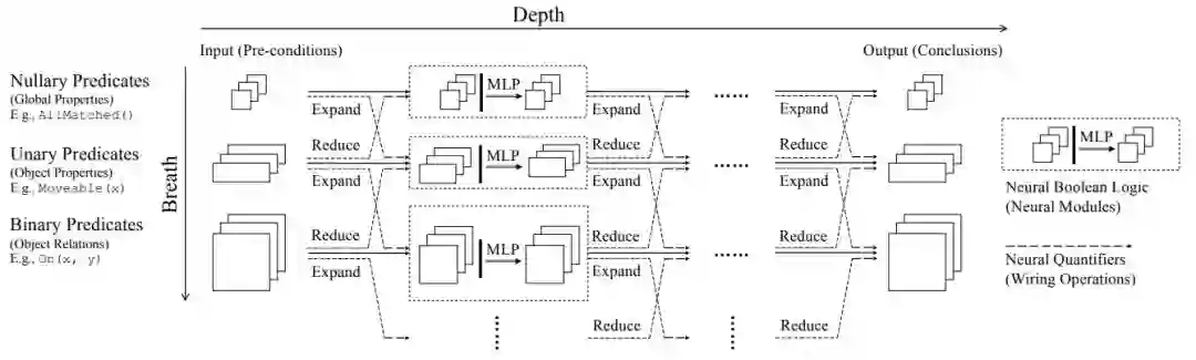 在这篇论文中,研究者提出了一种名为神经逻辑机(Neural Logic Machines,NLM)的算法,它可以解决上面学习方法解决不了的问题。简而言之,NLM 提供了一种神经符号(neural-symbolic)架构,它以一阶逻辑实现 Horn clauses (Horn, 1951)。NLM 的关键思想即神经网络可以高效地逼近逻辑运算,例如 AND 和 OR 等运算逻辑,且神经模块之间的连接可以实现逻辑量词。