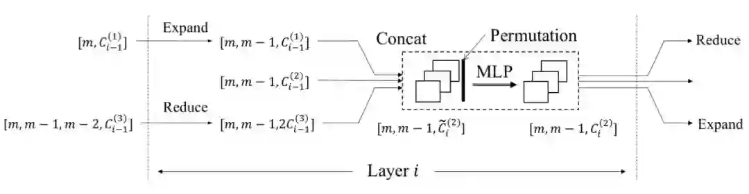 图 3:NLM 中的计算模块,以第 i 层的二元谓项为例。其中 C 的上下标分别表示组与层级,C 表示不同组与层级下的输出谓项数。[·] 表示张量形状。