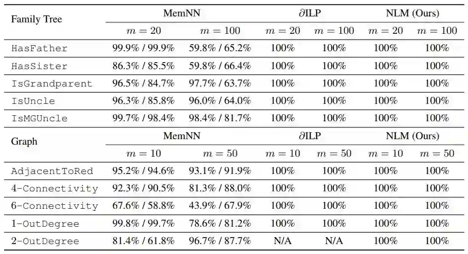表 1:在家族树和图推理任务中,MemNN、∂ILP 和 NLM 的对比,其中 m 表示家族树或图的规模。∂ILP 和 NLM 的性能均优于神经基线模型,在测试集上达到了 100% 的准确率。注意:N/A 标记表示 ∂ILP 无法在 2-OutDegree 中扩展。