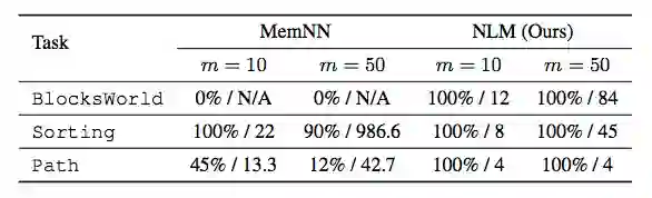 表 2:在积木世界、整数排序和寻找最短路径任务中,MemNN 和 NLM 的性能对比。