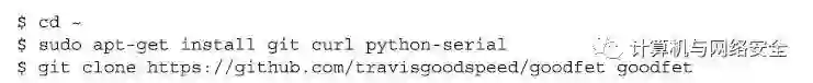 我们用GoodFET来刷新初始的引导程序bootloader代码到CC1111EMK设备的硬件上。首先,安装git的“版本管理工具”(version management tool),因为这是GoodFET程序开发包所需要的,然后下载最新版的GoodFET源代码,其操作命令格式如下。