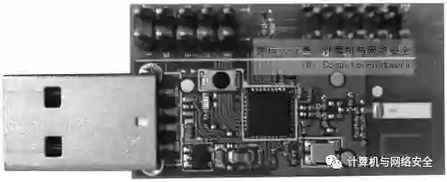 KillerZee工具并没有使用CC1110DK的硬件,而是使用了CC1111芯片,结合“得克萨斯仪器”公司USB接口的“评估模块集”(Evaluation Module Kit,EMK)作为其攻击硬件,该设备的实物图如图14所示。CC1111EMK设备使用一个类似于CC1110DK芯片的芯片,但是增加了USB功能,另有一些引脚的针用于程序的烧录。有一个灵活的按钮可以用于自定义功能。不幸的是,这款CC1111EMK芯片相比于CC1110DK芯片少了一些功能,但对于执行一些Z-Wave网络上数据包的捕获操作,已有的功能绰绰有余。