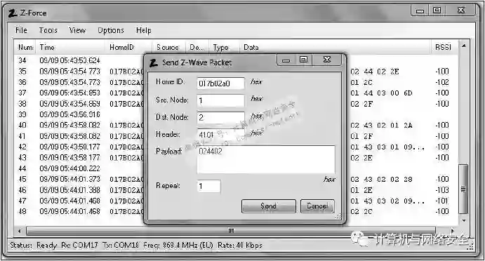 Z-Force工具包括数据包的发送功能,要进行“重播攻击”的时候,在该软件的“工具(Tools)|发送数据包(Send Packet)”菜单选项里,输入目标网络的“HomeID”(即界面上的“Home ID”)、“源节点ID”(即界面上的“src Node”)、“目标节点ID”(即界面上的“Dst Node”)、“帧控制”(frame control)的值(就是Z-Wave数据包头中的“有效载荷头部”Header字段,也是界面上的同名项),上述各值都是以十六进制格式表示,接下来输入要发送数据包的有效载荷的内容(即界面上的“Payload”),输入发送重复次数,然后单击“发送”按钮,程序的界面如图16所示。