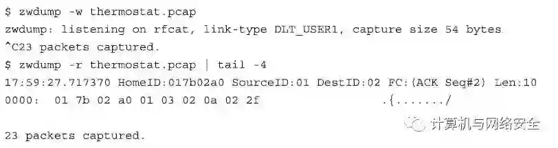 要评价这种类型的攻击所造成的影响,需要捕获一些数据包并“重播”一下,然后观察目标Z-Wave设备的行为。例如,把温度计设置为恒温,向其发送“降低1度”的指令,然后观察随着每个重播数据包的发送,该温度计的设定温度是不是持续降下来了。如果从捕获数据包的文件中找到一个特定的数据包,然后想将这个数据与其他剩余的数据包隔离开,那么只需要使用Wireshark工具集中的tshark工具就可以将所选的这一个或几个特定的数据包单独再生成一个新的数据包捕获文件。在下面的示例中,我们就从原始捕获的数据包文件中提取出帧顺序号为5的那个数据包帧,并将该数据包保存到一个单独的数据包捕获文件中。其操作命令格式的效果如下: