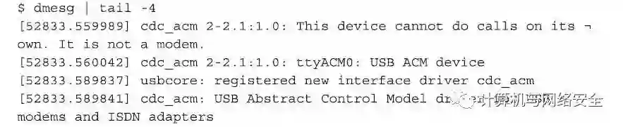 下一步,将CC1111EMK设备设置为bootloader模式,设置的方式是按住设备面板上的按钮,然后将设备插入到计算机上一个可用的USB端口,一旦插好,就可以放开按钮。这时,会看到CC1111EMK设备外壳上绿色的LED类就会亮起来,这时查看Linux操作系统上的内核日志,会看到有一个新的串口设备在系统中注册,其效果如下所示: