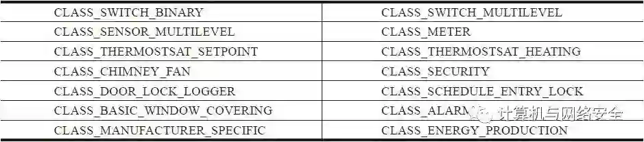 Z-Wave网络使用应用程序“命令分类”(command class)的方式来区分网络上的“行为”(action)和“响应”(response)。然而“Z-Wave联盟”对于“命令分类”本身并没有公开的文档说明,只是在一些开放源码项目中可以找到一些蛛丝马迹,比如在一个开源的“OpenZWave Library”项目的一些源码中给出了许多提供给程序员用于识别命令功能的“命令分类”;在表4中列出了这些“命令分类”的一个简短的列表。