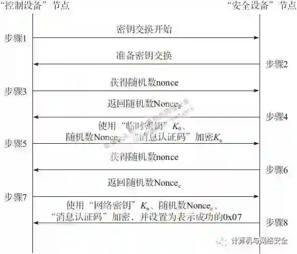 当“安全设备”从“控制设备”处接收到加密的网络密钥Kn和“消息认证码”之后,“安全设备”会验证“消息认证码”,并使用K解密所接收到的消息。然后“安全设备”会注册解密后的Kn,并将其作为当前的密钥。下一步,“安全设备”反过来请求“控制设备”给一个随机数,“控制设备”也会返回一个随机数Noncec(Noncec即“Controller Nonce”,意指由“控制设备”产生的随机数)。拿到这个随机数以后,“安全设备”会使用Kn加密一个“密钥设置完毕”(该消息的“命令”字段值为0x07)的消息发送给“控制设备”。“控制设备”在接收到“密钥设置完毕”消息以后,使用Kn,加上“消息认证码”一起对数据内容进行解密,解密后看到消息是“密钥设置完毕”就知道双方的密钥交换过程成功。