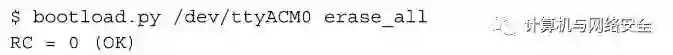 接下来将CC1111EMK设备也设置为bootloader模式,不过,这个设备设置为bootloader模式不需要按按钮,而是运行bootloader.py脚本。运行后,该程序会从可访问的闪存区域删除其中原有的所有内容: