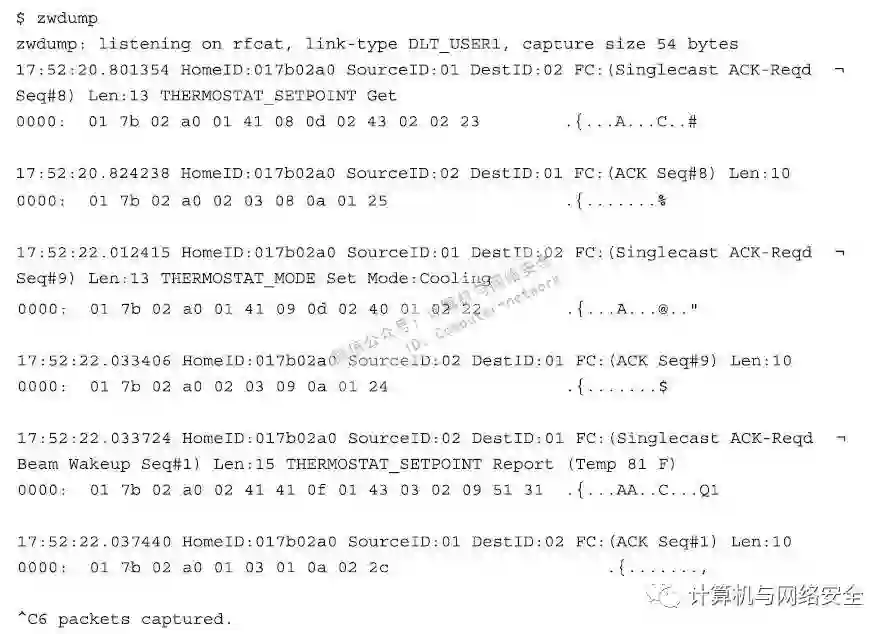 这款Z-Wave温控计实现COMMAND_CLASS_THERMOSTAT_MODE功能,该功能用来设置温控计的操作模式。一个“控制设备”可以通过发送命令来控制温控计,改变预设将要达到的温度,所改变的值可以是一个或多个数值,例如加热、冷却、只通风、空气干燥,节省加热或冷却,以及更多功能的值。要完成上述操作,攻击者可以使用zwdump工具来捕获和保存这些行为的通信数据包,该命令的格式和执行效果如下所示: