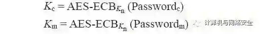 在加载“网络密钥”Kn以后,“安全设备”生成两个额外的密钥,Kc和Km,(其中,Kc是“数据包加密密钥”,Km是“信息认证密钥”),然后使用“高级加密标准-电子密码本模式”(Advanced Encryption Standard-Electronic Codebook Mode,AES-ECB)加密算法生成密码。