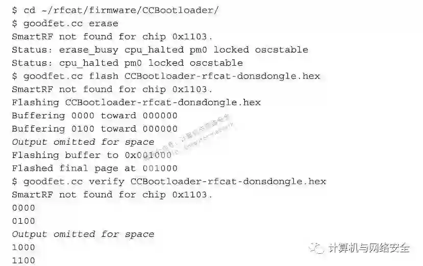 现在,GoodFET就可以与CC1111芯片进行通信了。下一步,将CCBootloader代码刷到芯片上,该步骤的运行结果如下所示: