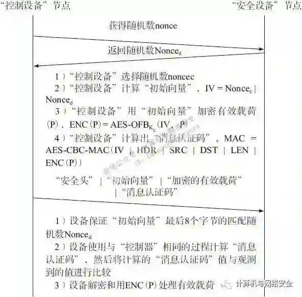 当一个“控制设备”想要发送一个消息到一个安全的“从设备”上,那么这个“控制设备”必须首先向这个“安全设备”请求一个随机数,然后使用这个随机数作为“消息认证码”MAC的一部分参与运算,并将其回复给“从设备”。当“从设备”返回随机数后,“控制设备”会选择自己的随机数,将该随机数与从“从设备”发送给“控制设备”的随机数组合起来,生成一个“初始向量”(Initialization Vector,IV)值。通过“初始向量”值,“控制设备”可以使用“初始向量”和“数据包加密钥”Kc加密数据包的有效载荷(简称P),然后使用“信息认证密钥”Km计算“消息认证码”。“消息认证码”的计算包括“初始向量”,“安全头”(HDR),“源节点ID”(SRC),“目的节点ID”(DST),“有效载荷的长度”(LEN)和“加密的有效载荷”(ENC(P))。这个交换过程如图8所示。
