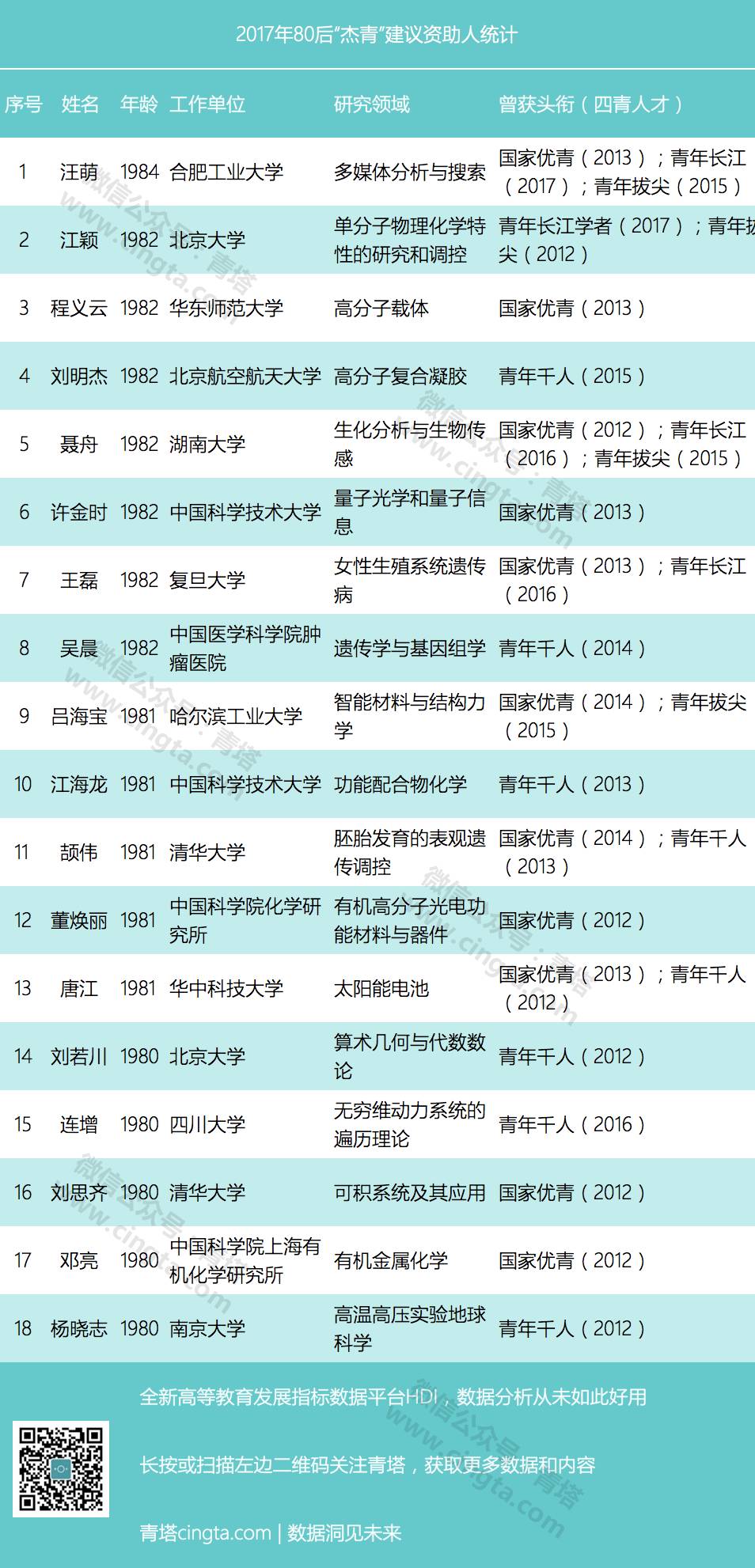 与往年不同的是,今年“国家杰青”年轻化成为新的亮点。根据青塔的统计,2017年国家杰青建议资助申请人平均年龄为42岁,相比前几年小了不少。更加值得关注的是,今年更是有18位“80后”入选国家杰青,这一数据比过去几年要多很多。其中合肥工业大学教授汪萌出生于1984年,目前只有33岁,汪萌教授若通过今年的最终评审,将成为目前最年轻的国家杰青入选者。