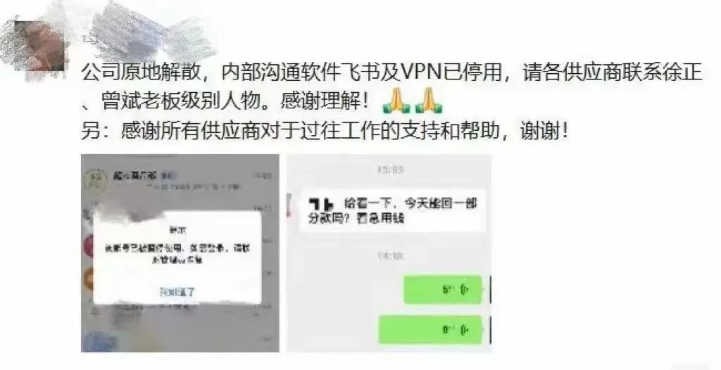 有员工社交平台发布动态称,(每日优鲜)公司原地解散,内部沟通软件飞书及VPN已停用。