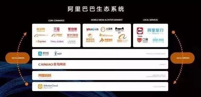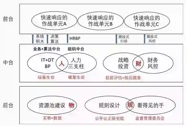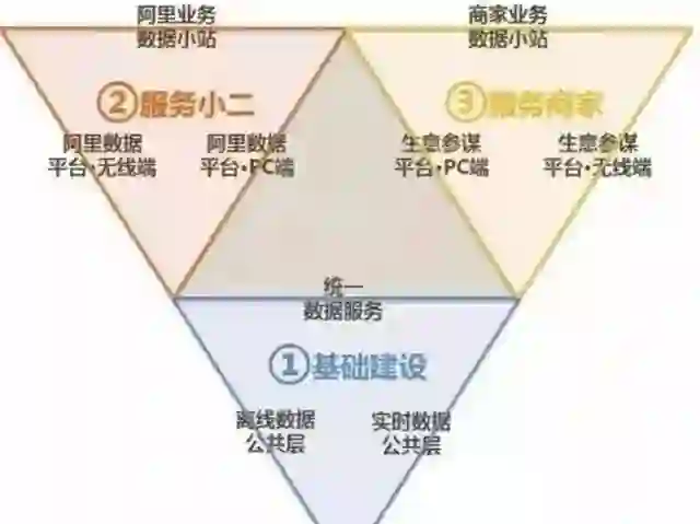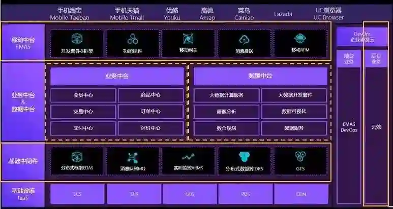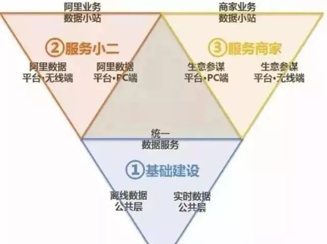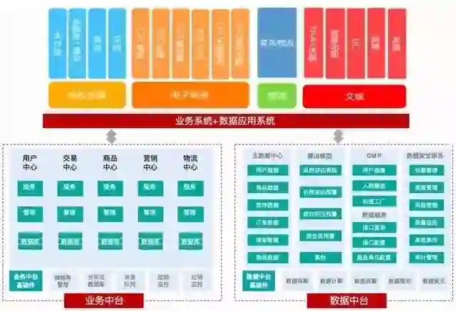 2、阿里“双中台”共同支撑的“大中台+小前台”架构。业务中台与数据中台相辅相成、互相支撑,一起构建起了战场强大的后方炮火群和雷达阵。