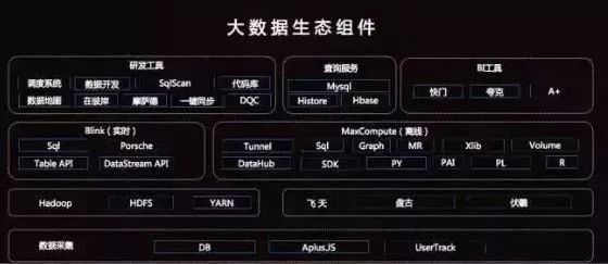 阿里数据中台在架构的组成上,呈现了一个“四横三纵”的结构,底层的基础设施来自于阿里云平台。