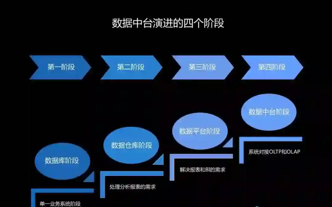 7、阿里数据中台演进的四个阶段。数据库、数据仓库、数据平台、数据中台。