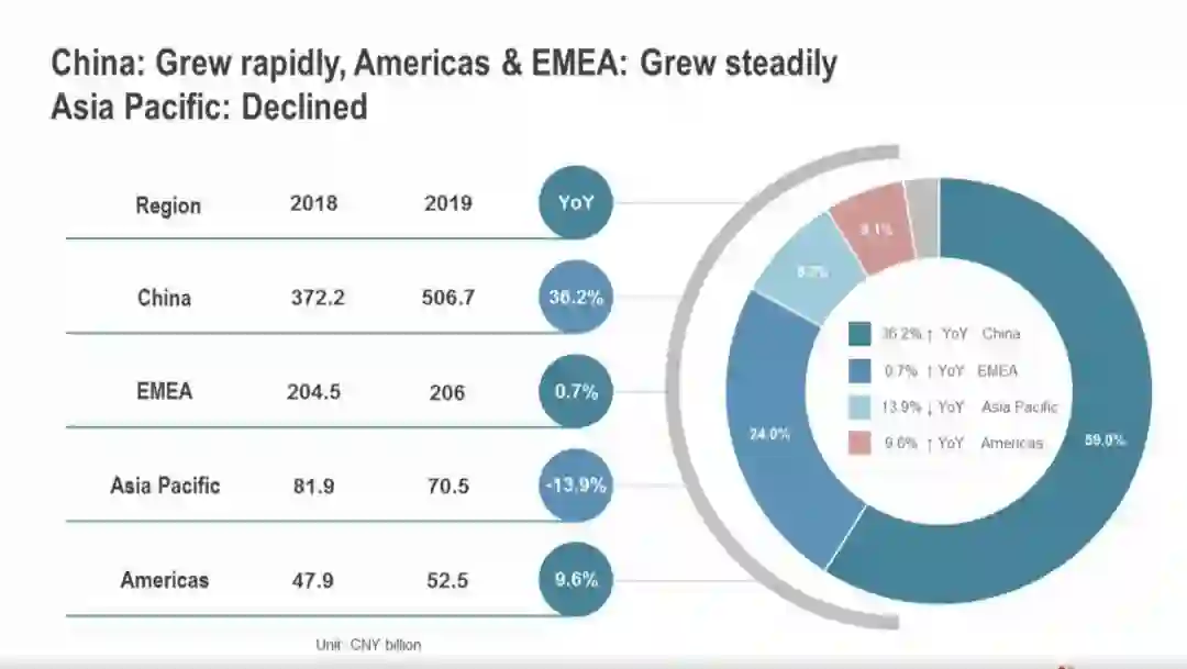 华为在亚太地区和美洲市场的业务盘子相对较小,前者下滑13.9%,后者上升9.6%。对于亚太地区的下滑,华为解释称,这是因为受一些国家运营商市场投资周期波动,以及消费者业务不能使用GMS生态的影响。