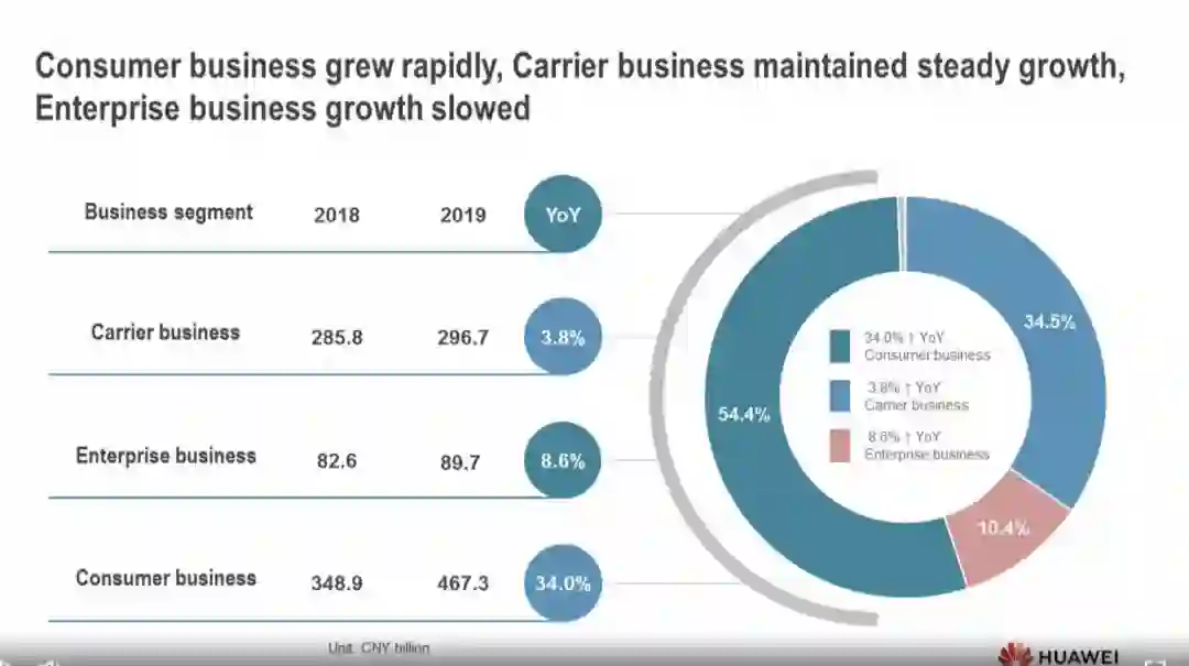 各大业务来看,2019年消费者业务收入4673亿元,占公司总收入比例达到54.4%,同比增长34%,智能手机发货量超过2.4亿台。由于美国禁令的影响,消费者业务增速低于此前一年,但依然是华为三大业务中增速最快的,对华为营收的贡献率进一步提升,消费者业务从2018年开始,已成为华为第一大营收支柱。
