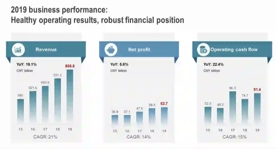 华为轮值董事长徐直军表示,2019年华为基本取得符合预期的业绩。2019年,华为实现全球销售收入8,588亿元人民币,同比增长19.1%,净利润627亿元人民币,同比增长5.6%,明显低于过去五年的年均增长率14%,经营活动现金流914亿元,同比增长22.4%。