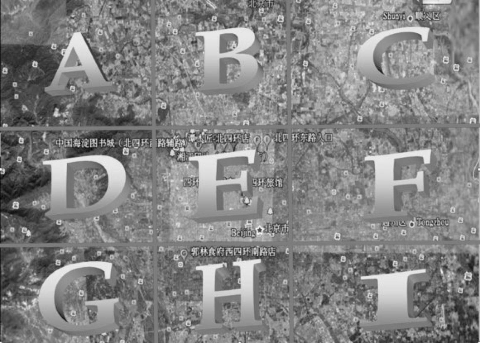 首先,他用GoogleEarth,截取了一张北京城区的俯视图,并将其划分为A-I九个区域。