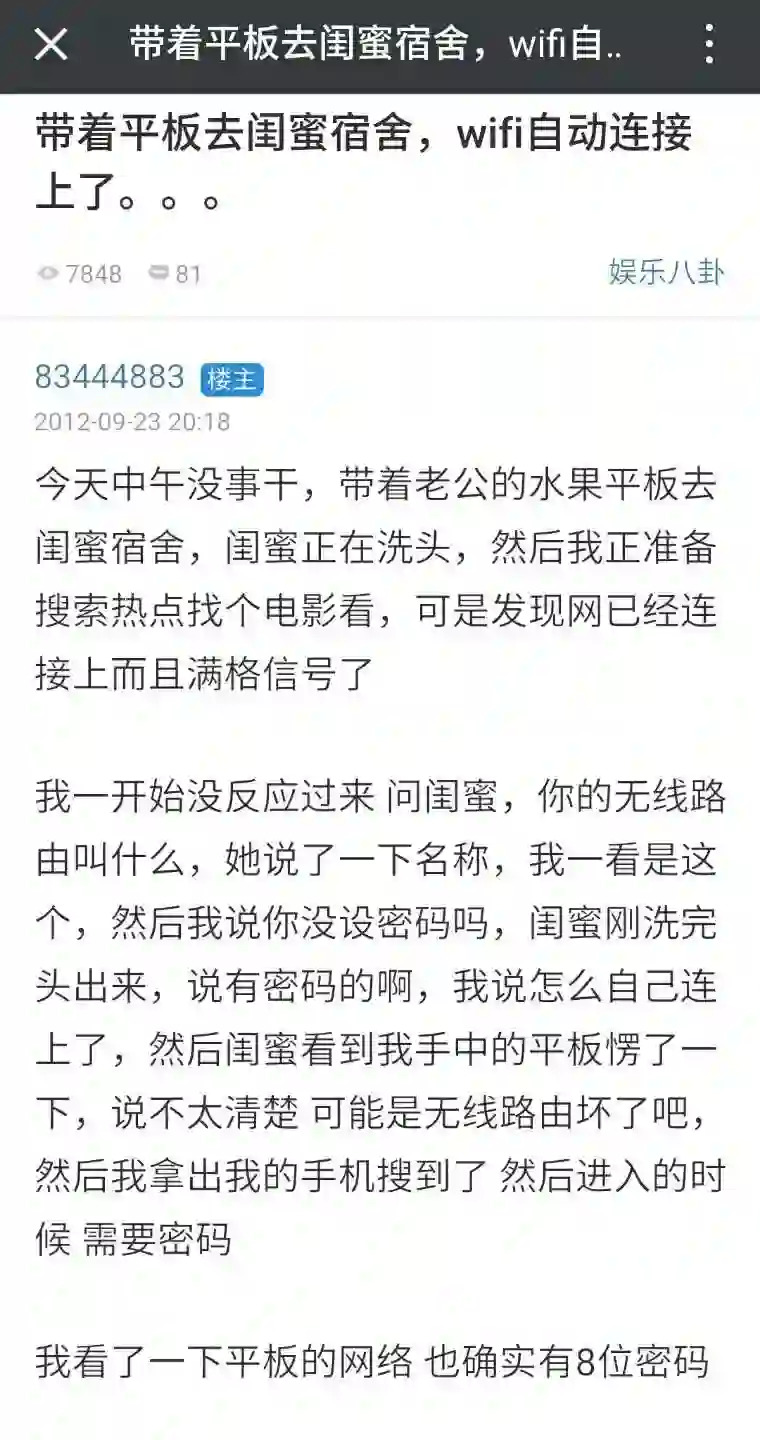 在天涯看到一个故事,一女生带着老公的平板去闺蜜家玩,打开iPad发现wifi自动连上了。