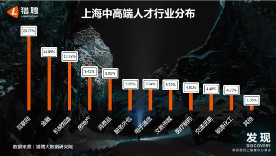 在猎聘平台上,上海中高端人才在互联网行业分布最多,占比达到20.77%;名列第二、第三的是金融、机械制造行业,其占比分别为14.89%、13.69%。