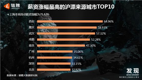 本次报告主要随机抽取、我们研究了猎聘平台上约63万个上海中高端人才样本,结果显示,在流入上海的中高端人才的薪资涨幅上,来自西安的人涨薪幅度最高,为64.96%;在从上海流向其他城市所产生的薪资涨幅上,流向北京的人涨薪幅度最高,为31.21%。