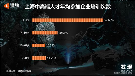 我们在问卷调研中发现,上海中高端人才平均每年参加的企业培训次数较少,57.63%的人为1-4次;20.56%的人为4-10次。