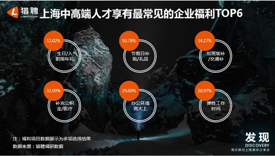 对于员工而言,企业福利与他们的切身利益和职场幸福感密切相关。调研发现,上海中高端人才享有最常见的企业福利排名前两项的是生日/入职周年礼品、节假日补贴/礼品,均为纪念性福利,其得票率分别为52.02%、50.78%。企业纪念性福利最易增强员工的仪式感,进一步提升其对企业的归属感,促使两者的关系更为和谐。