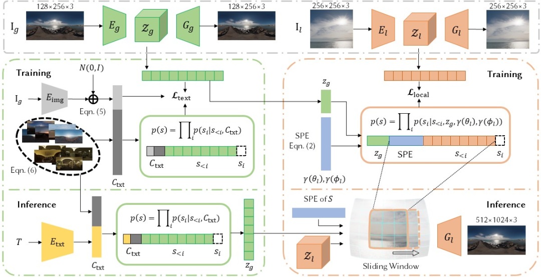1)全局 - 局部层级码本:我们使用 VQVAE 的训练方法,将极低分辨率的全景图嵌入到全局 (global) 码本中,将高分辨率的图像块 (patch) 嵌入到局部 (local) 码本中。这样一来就可以从全局码本中采样具有空间一致性和整体感的全局特征,同时从局部码本中采样获得局部细节。