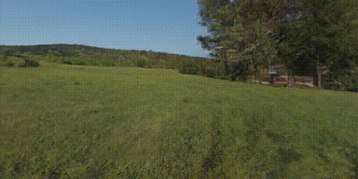输入 (green grass field with trees and mountains in the distance), 我们能得到下面这样沉浸式的 VR 体验!
