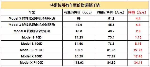 3月1日消息,特斯拉全系车型再次出现大幅调价,其最高降幅车型为Model X P100D车型,降幅达到了34.11万。其中Model 3降价区间为2.6-4.4万、Model S降价为1.13-27.75万、Model X降价区间为17.45-34.11万。具体车型降价对比如下: