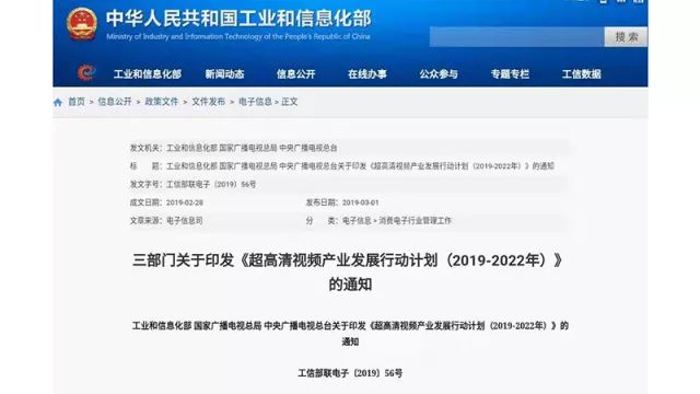 智东西3月1日消息,工业和信息化部、国家广播电视总局、中央广播电视总台三部门印发《超高清视频产业发展行动计划(2019-2022年)》。并提出到2022年,我国超高清视频产业总体规模超过4万亿元,4K产业生态体系基本完善,8K关键技术产品研发和产业化取得突破,形成一批具有国际竞争力的企业。