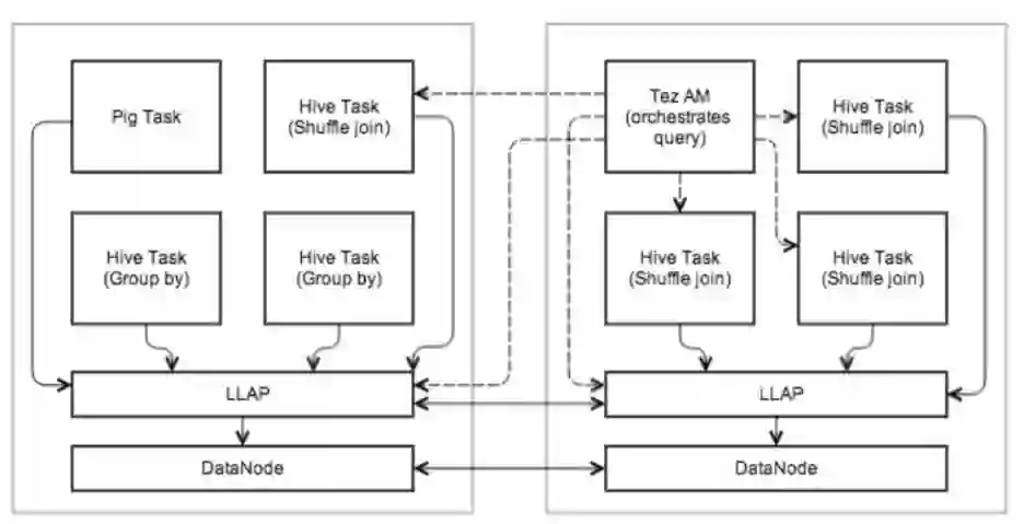 Hive 的 LLAP(低时延分析处理)技术,在 Hive 2.0 第一次引入,它所提供的功能正如其名一样。它在 YARN 上运行一个守护程序来协调作业的运行,这样小的运行就由守护程序来进行安排,要更多资源的作业就交由成熟的 YARN 作业来完成。这种方式可以进行更快的查询,同时仍可以让用户选择运行很多需要访问大量数据的作业,从而接近大型 RDMBS 集群如 Postgres 所能提供的功能。