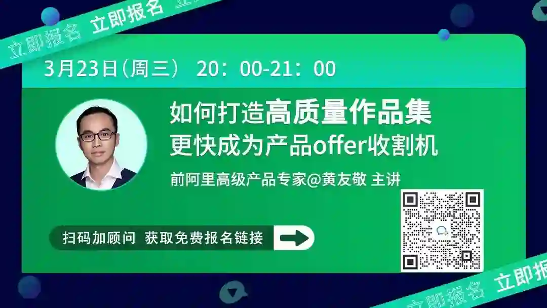 3月23日(周三)晚8点,前阿里高级产品专家@黄友敬老师带你拆解准备产品作品集的要点,针对意向岗位,有侧重地展示你能与之相匹配的能力,掌握加分项buff顺利拿offer!