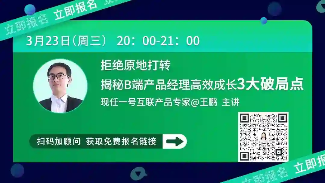 3月23日周三晚20点,现任一号互联产品专家@王鹏老师在线直播,1小时带你明晰B端产品经理核心竞争力,揭秘B端产品经理高效成长3大破局点。