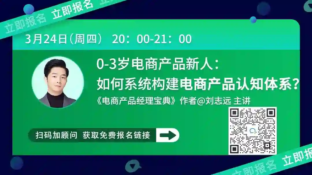 3月24日(周四)晚8点,《电商产品经理宝典》作者刘志远老师,1小时教你如何系统构建电商产品认知体系,帮助大家更快入门电商产品经理。