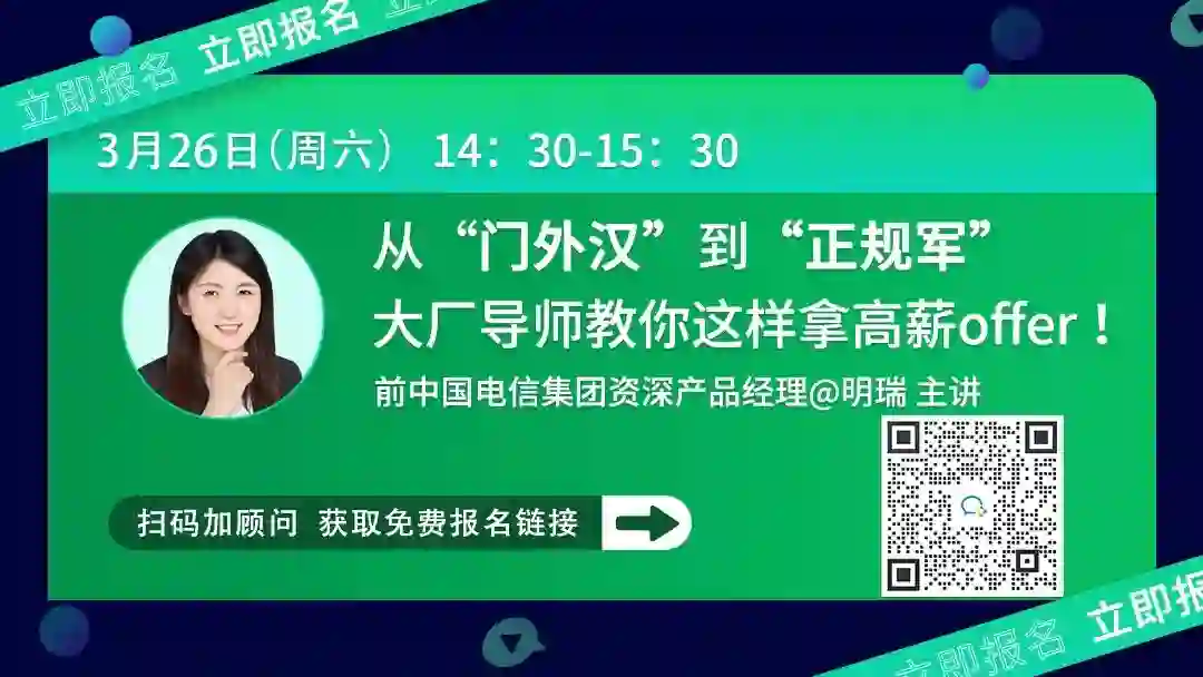 3月26日(周六)14:30,前中国电信集团资深产品经理@明瑞 讲解【从“门外汉”到“正规军”,大厂导师教你这样拿高薪产品offer !】