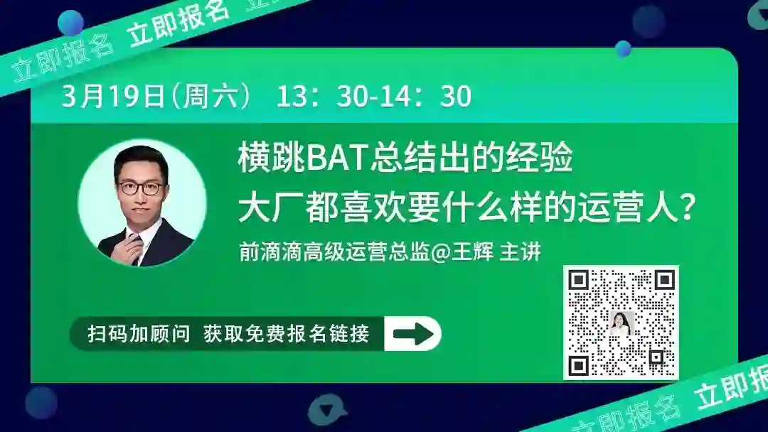 今天下午13:30(3月19日周六),前滴滴高级运营总监@王辉老师,带你深入了解真实的大厂运营工作,严苛的晋升流程以及学习怎样提升能力跳槽进大厂拿高薪!