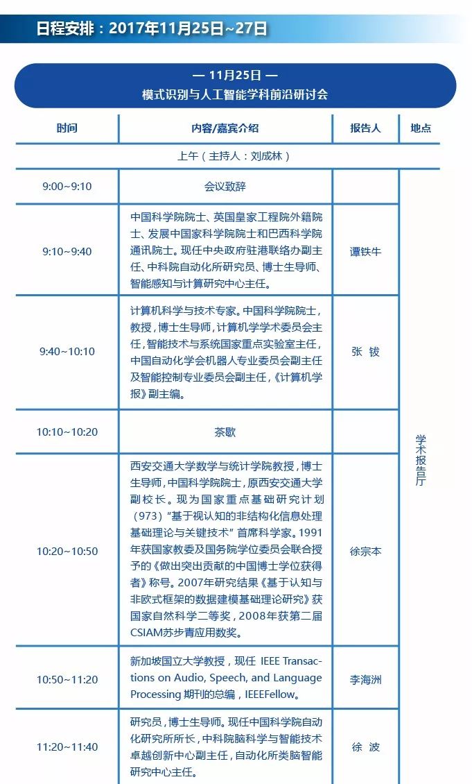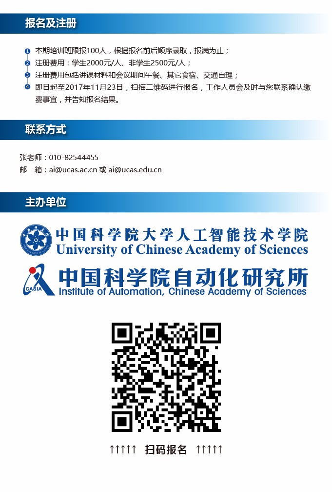 2017年11月26日-27日,中国科学院大学人工智能技术学院将联合中国科学院自动化研究所组织首届人工智能“智领未来”前沿培训班。培训班提供AI领域知名专家院士的免费讲座、针对个别领域做详细前沿解析的同时,还设有专门的参观体验环节。全方位系统性地为每一位对AI感兴趣的技术人士提供了解AI领域,进入AI领域的新通道。报名请戳到文末点击“阅读原文”。